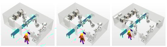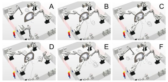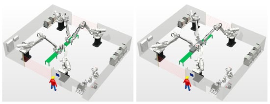 A common robot cell design with four winding robots and one cable preparation robot was developed and simulated for all three larger rotating machines S1a–c; see Figure 6. To achieve sufficient reach relative the different stators, ABB IRB 6650S industrial robots with 3.90 m reach and 90 kg payload capacity were used and placed on 1.2 m high pedestals for the winding. An ABB IRB 4600 industrial robot with 2.05 m reach and 60 kg payload capacity was used for the cable preparation. The complete cell floor dimensions were 8.5 × 10.5 m. A 3.5 m wide light curtain supervised openings in the cell fence to allow stator transportation through the cell and enable a smooth workflow. A smaller fence opening allowed cable drum replacement from the outside. The complete robot cell investment cost, including installation and commissioning, was estimated to be about 750,000 EUR. It was estimated that one operator could both supervise the robot cell and perform the following manual winding cables connection assembly step. The average electric power consumption of the robot cell was roughly estimated to be 15 kW and the maintenance cost to be 50,000 EUR/year.