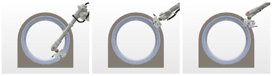 Robot reach and placement in the cell were critical for achieving the desired positioning against all slots on the stators, due to the large variation in stator dimensions. Smaller robots and cell designs were possible for winding only S1a and S1c. It was necessary to synchronize the work of the winding robot pairs—the second pair starting 90° after the first pair with full round stators—to avoid robot collision and cable tangling. The winding was performed in both directions, starting and ending at the bottom slots for S1a and S1c. For S1b, the winding started at the bottom slot and ended at the ends of the stator section. Robot positioning relative to the stator slots was performed with the cable feeder tools directed radially from the inside or outside of the stator—with respect to the robot axis configuration—to avoid cable twisting as the end windings were pulled, hence tool rotation to vertical was required when dropping the cable; see Figure 7.