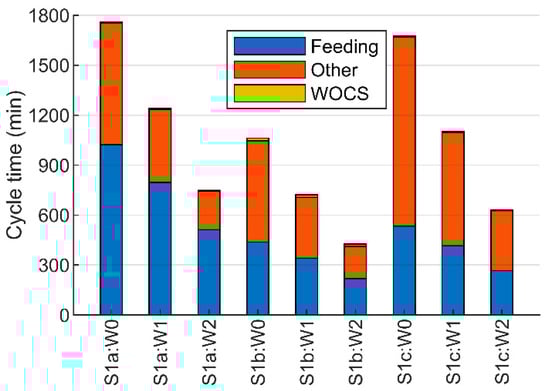 Estimated robot winding cycle time results for complete S1a–c stators in winding development scenarios W0–2, divided into feeding time, other time and WOCS time.