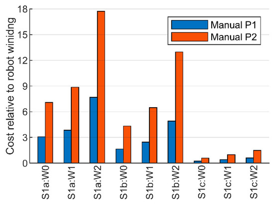Estimated assembly costs for manual stator cable winding relative to robotized stator cable winding of S1a–c in winding development scenarios W0–2, for P1–2.