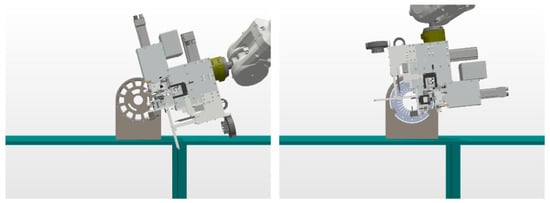 Robot positioning includes four different types of robot controller sub-procedures: against a slot hole to be wound, to drop the winding cable, to find the cable end and to hold or push down end windings. All such positioning must be defined based on well thought out assembly motions. In particular, cable twisting must be avoided as the cable is wound between different slot holes and the gravity force acting on the cable must be considered. This requires different measures depending on the stator design and winding pattern, as explained in detail below. After several iterations with different robot models and placements, optimized robot cell layouts were derived for S1–2 respectively. Simulations in ABB Robotstudio validated that sufficient reach could be achieved for the winding procedure relative all stators. For S1, the robots were placed on pedestals to provide sufficient reach without physically interfering with the winding process. It was, however, not always straightforward to find suitable robot models and placements, especially, for the common full flexibility robot cell layout for all S1–2 utilized, the manipulator reaches close to its maximum. Holding and pushing down the end windings was more complex compared to linear stators and could not be evaluated in detail without physical experiments, due to the cable deformability. Simulation validations were performed for numerous robot targets along the full stators, and a general process illustration is shown in Figure 5.