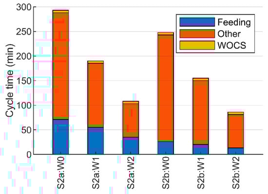 Estimated robot winding cycle time results for complete S2a–b stators in winding development scenarios W0–2, divided into feeding time, other time and WOCS time.