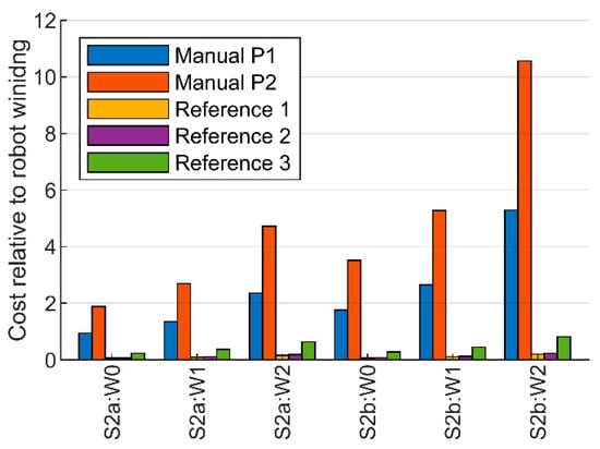 Estimated assembly costs for manual stator cable winding and conventional automated stator winding references scenarios from [4] relative to robotized stator cable winding of S2a–b in winding development scenarios W0–2, for P1–2 with manual winding and for P1 with conventional automation. References 1–2 are highly automated high throughput insert winding and hairpin winding, and Reference 3 is simpler lower throughput insert winding.