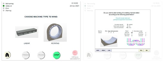 To demonstrate the product flexibility of robotized stator cable winding, robot winding positioning was simulated also for the S2 machines and a linear UU wave energy generator stator—investigated in earlier work [27]—in the larger robot cell developed for S1 in this work. With the smaller S2 machines, the winding robot pairs wound one stator each simultaneously, while the two robot pairs wound the linear stator together; see Figure 14. The winding cycle times were consistent with the results presented in Section 3.2.2 and Section 3.3.2, and in the earlier work. Furthermore, the GUI implemented on an operator process control touch screen in the earlier work could easily be extended to cover all types of machines; see Figure 15.