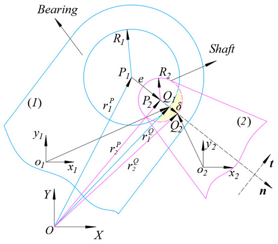 where (i = A, B; j = X, Y) are the components of contact force in the j directions at clearance joint i, respectively. and are the collision points of the bearing and shaft in rotating pair A, respectively. and are the collision points of the bearing and shaft in rotating pair B, respectively: