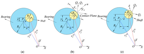 Due to the clearance of the revolute pair, according to the geometric relationship between the bearing and shaft, motion states between the shaft and bearing are divided into the free flight state, continuous contact state, and impact state, as shown in Figure 2.