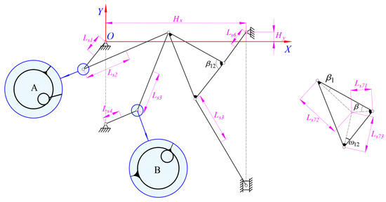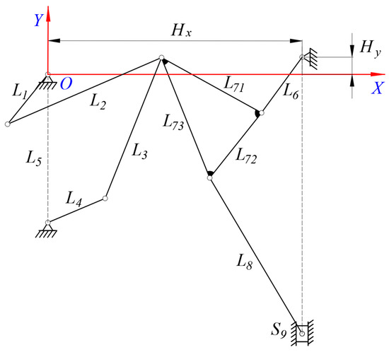 The diagram for a 2-DOF nine–bar mechanism is shown in Figure 3. The 2-DOF nine–bar mechanism is composed of crank 1 (L1), rod 2 (L2), rod 3 (L3), crank 4 (L4), frame 5 (L5), rod 6 (L6), a triangle plate 7 (L71, L72, L73), rod 8 (L8), and a slider (S9). It is known that the mechanism has eight movable members (crank 1, rod 2, rod 3, crank 4, rod 6, triangle plate 7, rod 8, and the slider) and one fixed member (frame 5). The revolute pair and translational pair are lower pairs; the number of lower pairs in this mechanism is 11. According to the calculation formula for the degree of freedom (DOF), the DOF of this mechanism is: