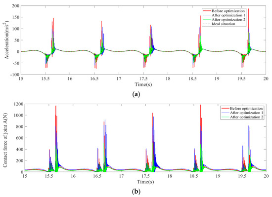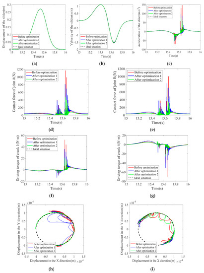 According to the acceleration curve, there are two optimization methods that can both effectively reduce the peak value of acceleration. It shows that the two methods have a good effect on improving the slider’s acceleration, but the optimization effect in “Optimization 2” is better than that of “Optimization 1”. Similarly, it can be seen from the contact force at the clearance joint and center trajectory diagram that when “Optimization 2” is adopted, the optimization effect is significant, and the times of peak and large amplitude of the dynamics are significantly reduced. However, when “Optimization 1” is adopted, the peak value of the contact force at the clearance joint is sometimes smaller than it was before optimization, and sometimes increases sharply. To sum up, when the objective function of optimization is to minimize the difference between the actual trajectory and the ideal trajectory, the optimization effect is stronger than that when the optimization objective function is to minimize the maximum acceleration of the slider.