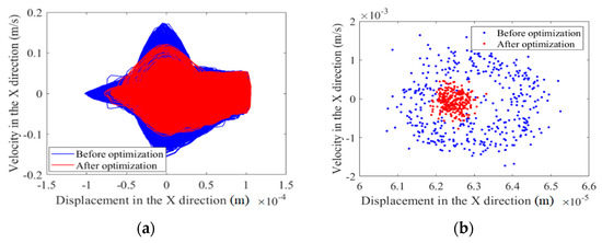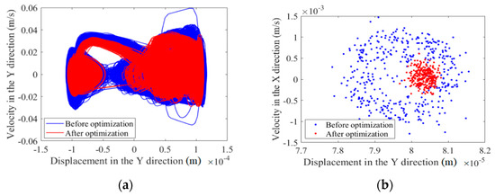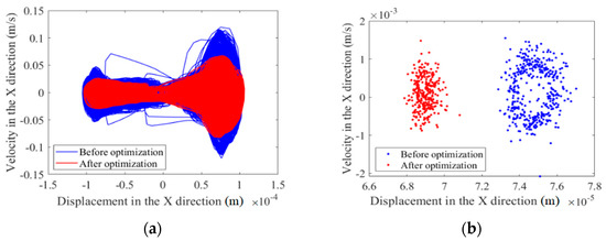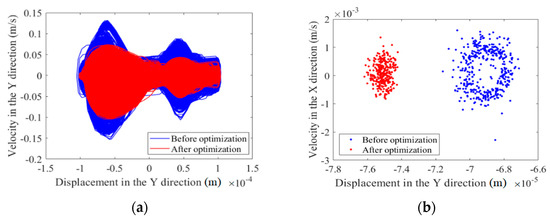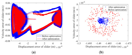Based on the optimization data obtained by optimizing the central trajectory at the clearance joints, the nonlinear characteristics of the clearance before and after optimization are analyzed. When the mechanism runs for 500 cycles, the nonlinear characteristics of a mechanism containing clearances before and after optimization are analyzed with a phase map and Poincaré map. The nonlinear characteristics of joints A and B are shown in Figure 7, Figure 8, Figure 9 and Figure 10. The nonlinear characteristics of the slider’s error are shown in Figure 11.