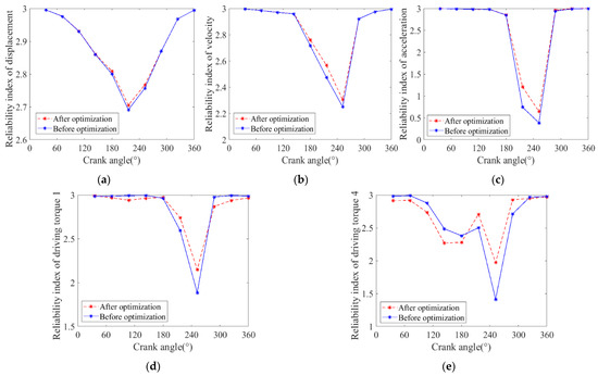 Based on the data yielded after optimization (where the optimization objective is to minimize the difference between the actual trajectory and ideal trajectory), the dynamics accuracy and reliability of the mechanism before and after optimization are compared and analyzed. The reliability index diagrams of displacement, velocity, acceleration, torque 1, and torque 4 are shown in Figure 12.
