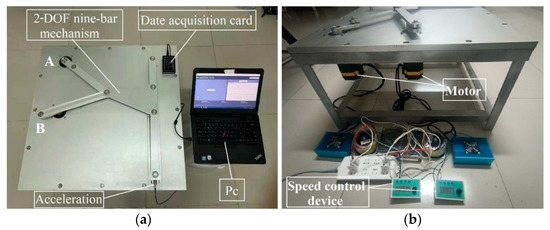 The 2-DOF nine–bar mechanism test bed is shown in Figure 13. The structural diagram of the 2-DOF nine–bar mechanism test platform is shown in Figure 14. The two motors are installed under the support plate, and the two cranks are driven by motors to drive the slider to move back and forth along the guide rail. The clearances between the two cranks and connecting rods are considered (revolute clearances A and B). The component is made of aluminum alloy, the elastic model is 70 Gpa, the bearing radius is 12 mm, and pin shafts with a clearance value of 0.1 mm are shown in Figure 15. In order to facilitate the processing and installation of parts, we have modified the dimensions to some extent. However, the theoretical results shown in Figure 16b are based on the theoretical model proposed in this paper. The geometric and inertial parameters of the test platform are shown in Table 4.