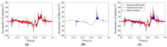 When the operating speeds of Crank 1 and Crank 4 are 60 rpm and −60 rpm, respectively, the comparison between the experimental results and theoretical results is shown in Figure 16. According to Figure 16a, the peak value of acceleration corresponding to the experimental results is 50.36 m/s2. According to Figure 16b, the peak value of acceleration corresponding to the theoretical calculation results is 65.43 m/s2. As shown in Figure 16c, it can be seen from the figure that the two curves are basically consistent in trend, but there is a certain difference in value. The comparison between the theoretical and experimental numerical results of the maximum acceleration is shown in Table 5. According to the data in Table 5, the error between the theoretical result and the experimental result is 15.07 m/s2, and the error rate is 23.03%. The main reason is that the vibration of the mechanism and the friction of the components lead to a decrease in the peak value of the experimental results and the acceleration of the vibration frequency. This can basically verify the correctness of the theoretical results.