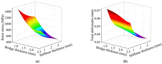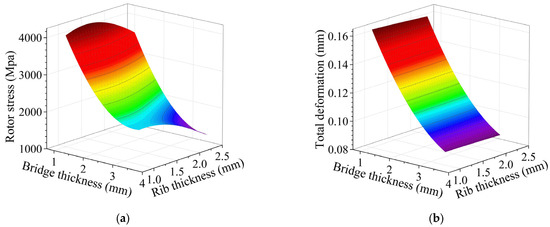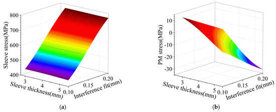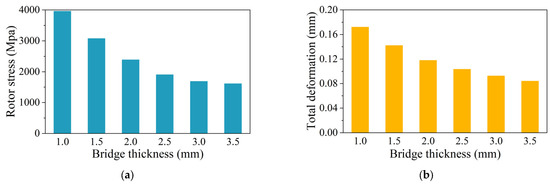 - For the rotor stress analysis and comparison, both rotor structures meet the stress constraints, but the IPM has a small margin. As the sleeve thickness of SPM increases, the equivalent stress of the sleeve and the tangential stress of PM decrease. When the sleeve thickness is 5 mm, the sleeve stress is 596 MPa, while the yield strength of the carbon-fiber sleeve is 1960 MPa. The IPM structure has a conflict between rotor flux leakage and rotor stress. The traditional radial structure cannot meet the stress constraints. When the thickness of the magnetic bridge is 3.5 mm, the rotor stress is 1690 MPa, which is much larger than the yield strength of the rotor corn of 480 MPa. Dividing the PM into two sections and adding a stiffener can effectively reduce the rotor stress. When the stiffener thickness is 2.8 mm, the leakage flux factor is as high as 1.72, and the rotor stress is 430 MPa, which is close to the yield strength of the rotor core.