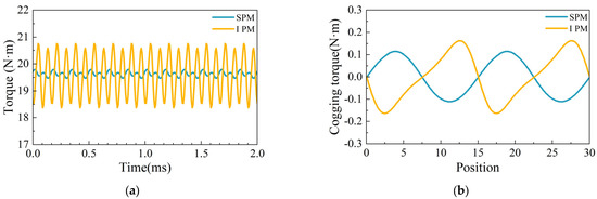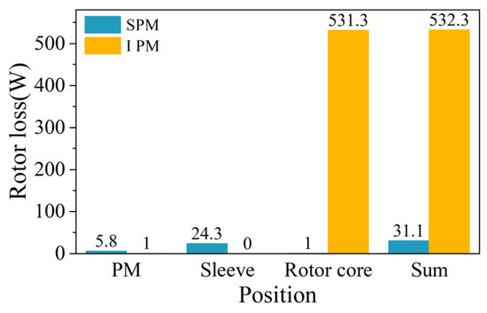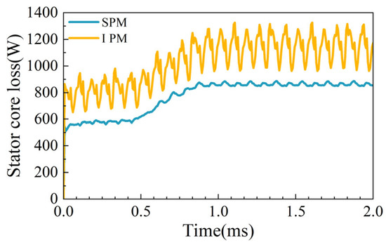 - For the electromagnetic field analysis and comparison, the loss of the two rotor structures is quite different, and the performance of other aspects is similar. Compared with IPM, the line back-EMF and air-gap flux density waveforms of SPM are closer to sine waves. The torque of SPM is slightly greater than that of IPM. In addition, the rotor loss of IPM is 532 W while the rotor loss of SPM is 31 W. The stator core loss of IPM is 1149 W while the stator core loss of SPM is 863 W.