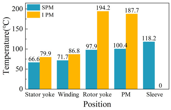 - For the temperature-field analysis comparison, the temperature difference of the rotor part is larger than that of the stator part for the two rotor structures. The stator temperature of SPM is 66.6 °C while the stator temperature of IPM is 79.9 °C. The rotor temperature of SPM is 98 °C due to the poor thermal conductivity of the carbon-fiber sleeve. Although the IPM rotor structure has better heat dissipation performance, the rotor temperature is as high as 194 °C due to large losses. The IPM temperature distribution does not satisfy the temperature-field constraints.