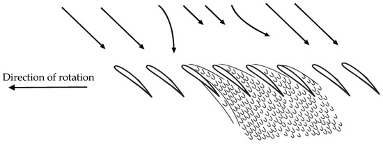 In order to explain the proposed model of prediction of stall inception and surge in this paper, the whole stalling process of a low-speed compressor is discussed in this section. The model has been developed based on the basic stalling process of previous experimental and analytical research [1,2,3,6,7,8,23], in which the whole operating conditions from pre-stall to stall and in-stall conditions are considered. The basic process of stalling a compressor is composed of several conditions: As a compressor is operating between the maximum mass flow to the design operating points, the compressor provides a pressure rise, and no disturbances exist in the blade row. As the mass flow is reduced, small disturbances in the form of flow separation appear at the blade suction side. These separations form due to adverse pressure gradient and boundary layer effects. With the subsequent reduction in mass flow, the small disturbances grow in size and accumulate in the blade passages. While the compressor is still operating in pre-stall condition, the disturbances grow in size and cover several blade passages. Up to now, the disturbances are confined to the blade passages and are not moving along the blade row. Once the mass flow reaches a critical value, instead of all blades stalling together as is expected, all the blades do not stall simultaneously. At some point, the stall cell, which is made up of low momentum regions, starts to propagate along the blade row. Afterward, the disturbances merge together and form a number of stall cells with a further reduction in mass flow. Eventually, the stall cells merge together and form a big stall cell. The propagation speed of the stall cells is approximately 20–80% of the rotor speed [24]. The number of stall cells that forms in the annulus is dependent on compressor design and flow behavior and cannot be predicted accurately for a newly designed compressor [1]. With further reduction in the mass flow, the compressor encounters the global surge condition and, subsequently, breakdown of the compressor may occur. It has been stated that rotating stall usually precedes surge. An example of a stall cell formation and propagation is shown in Figure 1.