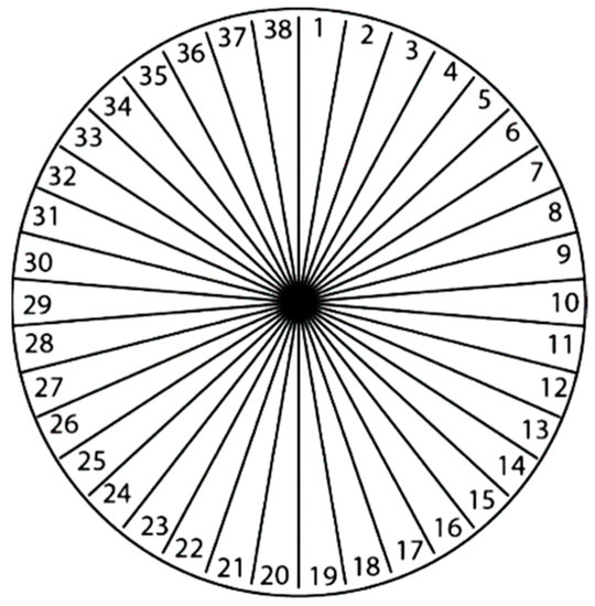 The full-annulus compressor is reconstructed conceptually based on the special combinations of the single-passage simulations from Table 1 to cover the whole operating range of the compressor, including pre-stall, stall, and in-stall operating conditions. Here, a number of 38 rotor passages is utilized since the experimental compressor has 38 rotor blades, as shown schematically in Figure 2.