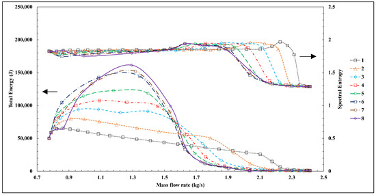 As can be seen from Figure 3, at higher mass flow rates than 2.35 kg/s, the total energy for all the number of stall cells is at its lowest amount. This signifies that the vibration and noise of the compressor are minimal. Furthermore, all the stall cell numbers have identical spectral entropy, which shows that the probability of stall cell formation is similar.