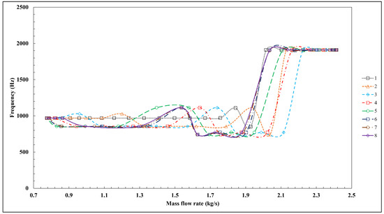 In the preceding section, the pressure signals consisting of the variation in static pressure versus time were generated for every total mass flow and stall cell number. The pressure signals are used in this section to estimate the frequencies in the full-annulus compressor. Figure 4 shows the influence of the number of stall cells on the frequency from the maximum mass flow to stall and in-stall conditions. The frequency in this figure has been obtained by performing an FFT analysis of the corresponding stall cell number and mass flow and represents the peak frequency in the full-annulus configuration for every total mass flow. The total number of performing FFT analyses is equal to 137 times. The frequency in the context of this paper corresponds to the frequency of formation and propagation of the stall cells based on the full-annulus compressor approximation. As can be seen from Figure 4, at higher mass flow rates, the blade passing frequency (BPF) at 1900 Hz exists for all the number of stall cells since no disturbance has been formed in the annulus yet. As the mass flow is reduced, secondary flow oscillations form and new frequencies related to these disturbances appear. Although the distributions of the frequencies vary slightly with the reduction in mass flow, the change in the frequencies is limited to a specific band between 700 Hz and 1100 Hz. The final frequency for all the number of stall cells is 969.6 Hz when the stall cells reach a fully developed condition. The analysis in this section investigates the possibility of defining criteria to detect compressor operating conditions based on the variation in frequencies as the mass flow is reduced. The figure shows that new frequencies develop at lower mass flow rates below 2.1 kg/s, but the distributions of the frequencies do not vary significantly toward the lower mass flow rates. In particular, no significant change of frequencies occurs at 1.6 kg/s, where surge instability is estimated to commence. Consequently, it can be concluded that a criterion based on the frequency change can show a rough estimation of the onset of rotating stall, but it cannot be used to estimate the onset of the global instability or surge condition.