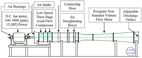 This research utilizes experimental compressor data to demonstrate and validate the application of the approximation method. The configuration under investigation is the axial compressor with the casing treatment employing 23.2% exposure. This research compressor was named Peregrine and was tested at Cranfield University in 2001 [25,26]. The test rig consisted of an electric motor, three repeating stages compressor, a bellmouth inlet, and an outlet ducting. The rotor shaft was driven by an electric motor at a design speed of 3000 rpm. A schematic of the research test rig is shown in Figure 5.