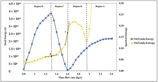 The SS (Total) of the total energy and the spectral entropy as a function of mass flow rate are shown in Figure 8. The total energy and the spectral entropy curves have been plotted on the same figure to show the correlation between them easily. As can be seen, the figure can be divided into four regions, namely A, B, C, and D. These regions coincide with the compressor stalling patterns as pre-stall, rotating stall, surge, and compressor failure, respectively. Region A is the region in which SS (Total) of the total energy and the spectral entropy reduce simultaneously. The spectral entropy reaches a local minimum at 1.95 kg/s while the total energy is still decreasing. This region is termed the pre-stall condition in which small disturbances are formed and expand with a reduction in mass flow. In region B, the total entropy reaches an inflection point at point A, and the total energy reaches a global minimum. In this region, the disturbances grow and reach a critical size and begin to move along the blade row. This region is termed the rotating stall. In region C, the total energy rises and attains a global maximum, while the total entropy reaches a new inflection point at B. In this region, noise and vibration are intensified due to increased secondary flow oscillations and surge initiates. The operation of the compressor in region D is termed the failure of the compressor since it follows surge, and the mass flow rate reaches very low.