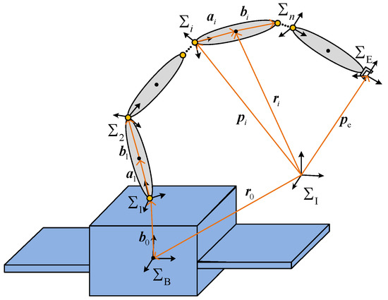 The potential energy is neglected, as the system is in a microgravity environment and the flexible characteristics of the joints and links are not considered. Substituting Equation (5) into the Lagrange equation, the dynamics model governing the motion of a free-floating space robot can be obtained [32,33].