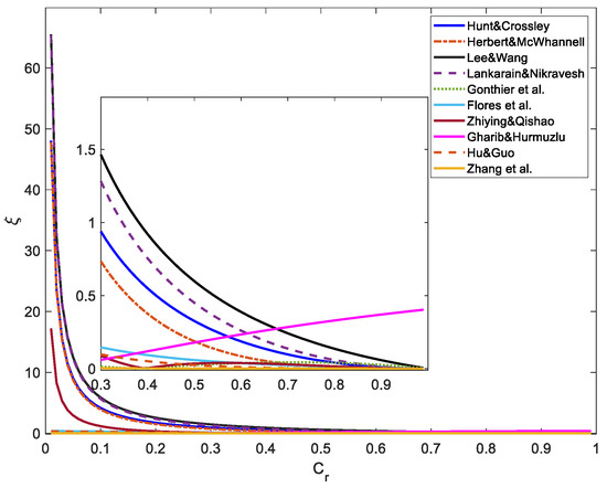 From Figure 3, it can be seen that the Hunt-Crossley, Herbert-McWhannell, Lee- Wang, and Lankarain-Nikravesh models are more suitable for the case with high input restitution coefficient, and conversely, the Gharib-–Hurmuzlu model is suitable for the case with low input restitution coefficient. The Gonthier et al. model, Flore et al. model, Hu-–Guo model and Zhang et al. model have better performance over the entire range. Generally, the restitution coefficient can be known in advance based on the contact environment, and in order to obtain more accurate information during the contact period, a suitable model with the smallest model error should be selected according to the input restitution coefficient.