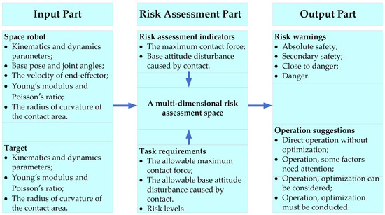 As shown in Figure 4, the risk assessment method proposed in this paper mainly consists of three parts: the input part, the risk assessment part and the output part. Pre-contact information of the space robot and the target is needed in the input part. It includes the kinematics and dynamics parameters of the space robot, the base pose and the joint angles, the velocity of the end-effector, and the mass and velocity of the target. The above input information can be used to calculate the value of the effective mass perceived at the end-effector of the space robot. The Young’s modulus, Poisson’s ratio and the radius of curvature of the contact area are needed to obtain the hysteresis damping factor and the contact stiffness parameter. The risk assessment indicators which are developed in Section 3.1 and Section 3.2 are both included in the risk assessment part. By combining the mechanical design standard or the task requirements, the risk warnings and the corresponding operation suggestions are given in the output part.