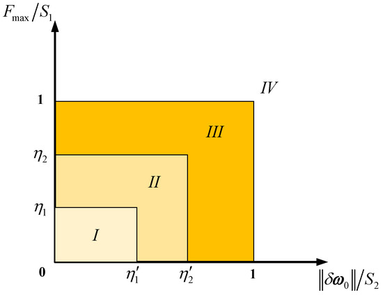 It is assumed that four risk levels and two risk indicators are considered in the risk assessment part, and the corresponding two-dimensional risk assessment space is shown in Figure 5 with its x-axis representing the base attitude disturbance indicator and y-axis representing the maximum contact force indicator. is the allowable maximum contact force on the end-effector and is the 2-norm of the allowable maximum base attitude disturbance. Therefore, and are the necessary conditions to ensure the safety of the contact tasks. and are the threshold values which need to be pre-determined for each indicator based on the mechanical design standard or the task requirements. Four risk levels are explained as follows.