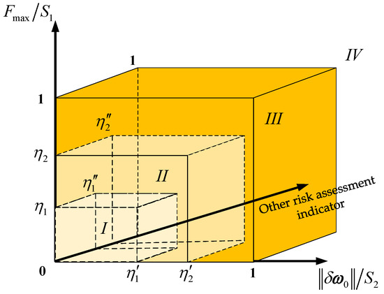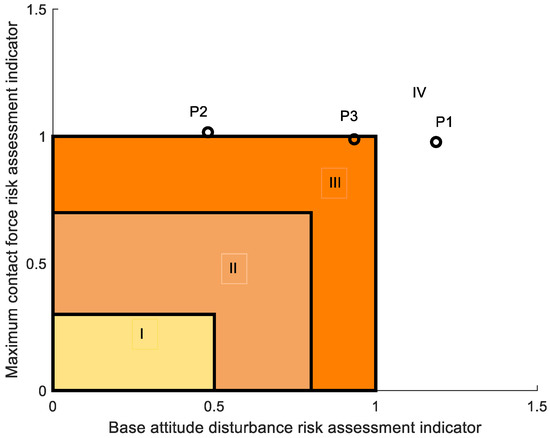 The initial contact configuration is [0,90,50,–10,58,90,0]deg, and the position and Euler angle of the base are [0,0,0]m and [0,0,0]deg, respectively, as shown in Figure 10. The other parameters related to the continuous contact model are set as , , , , , and the Zhang et al. model in Table 1 is selected as the hysteresis damping factor. The entire contact process can be calculated by the derivation in Section 3, which can help to obtain the maximum contact force of 1661.78 N and the base attitude disturbance of 0.89 deg/s. Assume that the allowable maximum contact force is 1700 N and the allowable base attitude disturbance is 0.75 deg/s, then set N and deg/s for safety. The risk assessment space with is shown in Figure 11. Point represents the risk location corresponding to the above condition. It belongs to Risk IV, which means dangerous, and the risk assessment indicator of base attitude disturbance must be optimized.