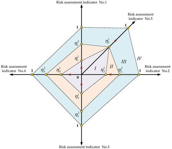 Step 4: According to the parameters in the input part and the calculation method in the risk assessment part of the risk assessment model, the values of each risk assessment indicator are marked on the corresponding axis as the red marker ‘*’ in Figure 7.