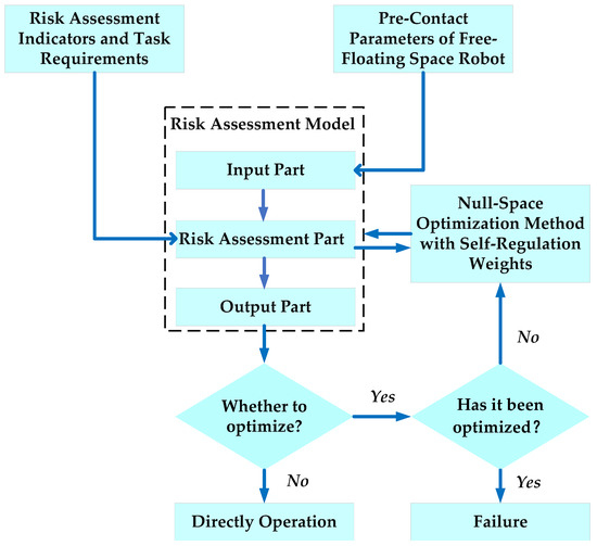 Figure 8 shows the flow chart of the risk assessment model-guided configuration optimization. Firstly, a multi-dimensional risk assessment space is established according to the risk assessment indicators and task requirements. Secondly, according to the pre-contact parameters of the free-floating space robot, the risk level of the contact task is judged to determine whether it needs to be optimized. Thirdly, if the task is judged as not to be optimized by the risk assessment model, then it is operated directly. If the task is judged to need optimization, the risk assessment model-guided optimization method is used to optimize the contact configuration of the free-floating space robot. Finally, re-judge whether the optimized contact configuration meets the risk level. If the task requirements are still not satisfied, the task cannot be performed. The null-space optimization method with self-regulation weights is derived in detail as follows.