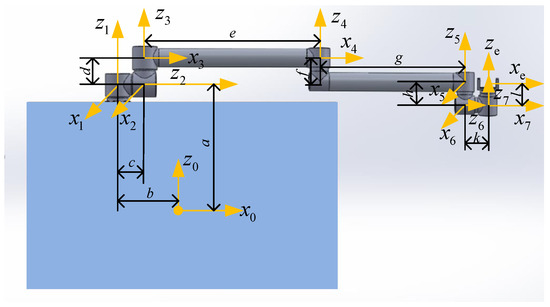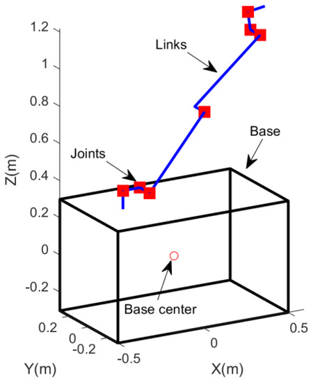 The robot with a 7-DOF humanoid arm structure is one of the most representative space robots. It has redundant characteristics relative to the task space, can flexibly complete various tasks and has a wide range of application prospects. The famous space robot Canadarm2 has the same structure [37]. At the same time, the optimization method proposed in this paper also requires the space robot to have redundant characteristics. Therefore, a 7-DOF free-floating space robot as shown in Figure 9 is studied, where a = 0.4 m, b = 0.3 m, c = 0.1 m, d = 0.1 m, e = 0.5 m, f = 0.1 m, g = 0.5 m, h = 0.1 m, k = 0.1 m, and l = 0.1 m. Its dynamics parameters are listed in Table 2.