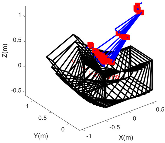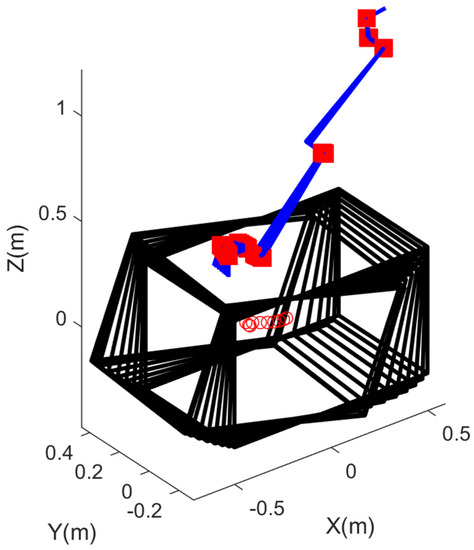 In the first case, the optimization does not consider the risk assessment model, and only optimizes the base attitude disturbance. The optimization process is shown in Figure 12. The contact configuration is optimized without affecting the end-effector pose. In the second case, the risk assessment model-guided optimization method with self-regulation weights proposed in the paper is adopted, considering both the base-attitude-disturbance indicator and the maximum-contact-force indicator. The optimization process is shown in Figure 13. The contact configuration is optimized without affecting the end-effector pose.
