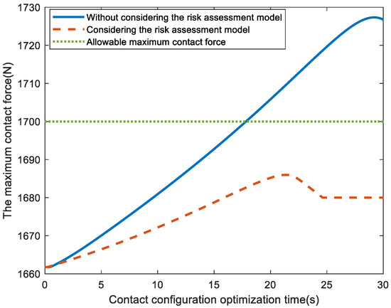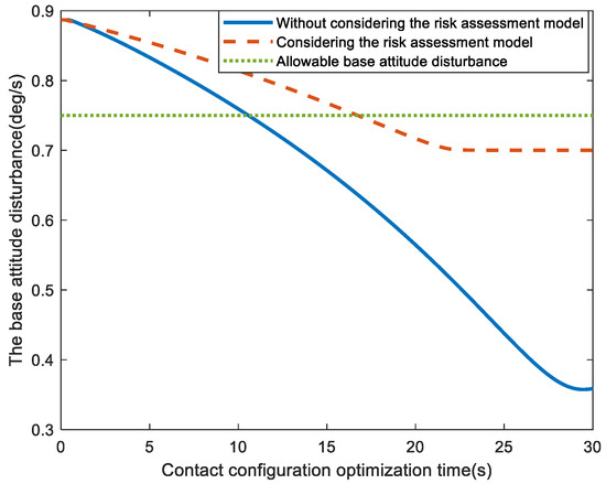 Figure 14 and Figure 15 show the comparison of the optimization with and without considering the risk assessment model. For the optimization case without considering the risk assessment model, the base attitude disturbance is reduced from 0.89 deg/s to 0.36 deg/s, which meets the requirement of being below 0.75 deg/s as shown in Figure 14. However, the two risk assessment indicators are not consistent, because the optimization of the base-attitude-disturbance indicator causes the maximum-contact-force indicator to become worse. It can be seen from Figure 15 that the corresponding maximum contact force during the base attitude disturbance optimization increases from 1661.78 N to 1726.92 N, which does not meet the requirement of being below 1700 N. Point in Figure 11 represents this risk location. For the optimization case, considering the risk assessment model, the base attitude disturbance is reduced from 0.89 deg/s to 0.70 deg/s, and the maximum contact force increases from 1661.78 N to 1685.98 N and then decreases to 1680.00 N under the effect of weight self-regulation. Point in Figure 11 represents this risk location; both the risk assessment indicators meet the requirements, and the contact task can be performed by the free-floating space robot. Therefore, it is necessary to consider the risk assessment model in the optimization process. When setting the optimization parameters, the maximum allowable value of the risk assessment indicators can be set to other risk level thresholds according to the task requirements.