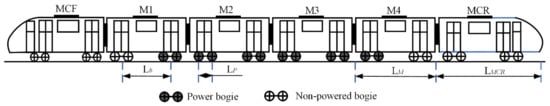 The straddle-type monorail vehicle is composed of six vehicle bodies named MCF, M1, M2, M3, M4 and MCR, in which totally 90 DOFs are considered. A typical straddle-type monorail vehicle is adopted in this work, and the arrangement of bogies and the dimension of the vehicle body are shown in Figure 2. (Note: Lb = 9600 mm, LP = 1500 mm, LM = 13,900 mm, LMCR = 14,800 mm, Monorail width = 2900 mm, Monorail height = 3590 mm)