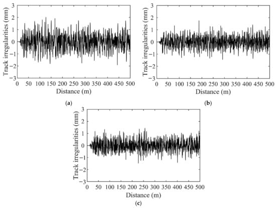 where denotes the power spectral density function of track beam irregularity; denotes the spatial circular frequency; represent the relevant parameters of the power spectral density function, as shown in Table 1.