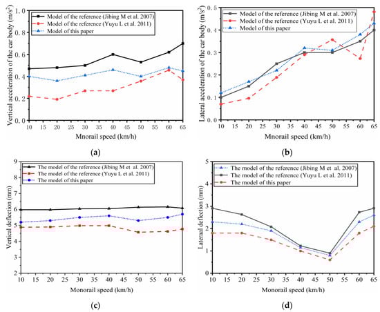 The validation of the dynamic model with Yuyu L et al., 2011 and Jibing M. 2007 [16,17]: (a) The vertical acceleration of the vehicle body; (b) The lateral acceleration of the vehicle body; (c) The vertical deflection at the middle span; (d) The lateral deflection at middle span.