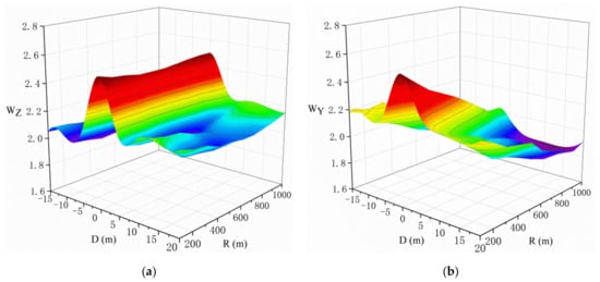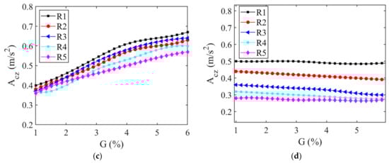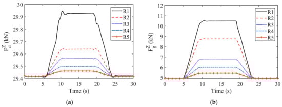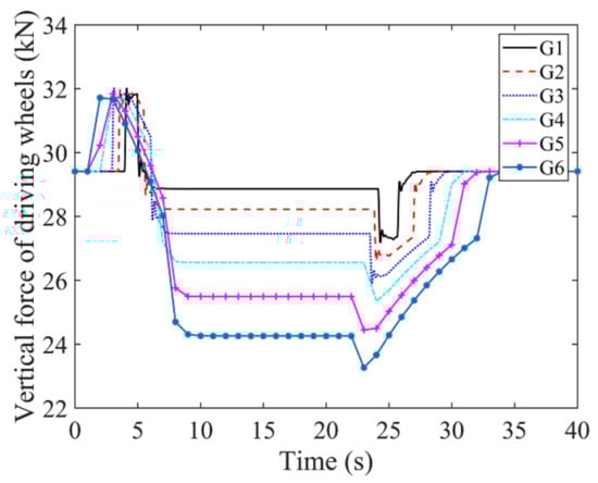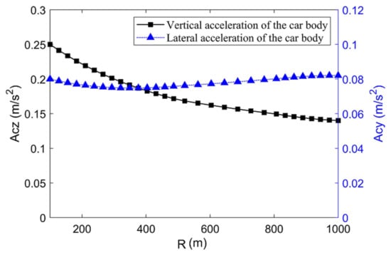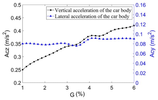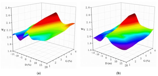 For the straddle-type monorail system, the dynamical running safety and vibration stability of driving must be ensured. Therefore, it is particularly important to reduce the dynamic response and transmission between the various subsystems when the vehicle passes over the elevated track beam. Based on this, the dynamic characteristics of the straddle-type monorail system under different spatial alignment (planar and vertical section) characteristics are the main objects to analyze and study. According to Formula (13), the vertical and lateral acceleration of vehicle body (g), the vertical force driving wheels (), the vertical force of guiding wheels () and the sperling index () are selected by the dynamic behaviors evaluation system for evaluation [17].