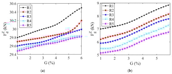 While the straddle-type monorail vehicle runs, the dynamic response of the leading vehicle (MCF) is more obvious than that of the middle vehicle (M1-M4) and the trailing vehicle (MCR), that is, the leading vehicle (MCF) is most sensitive to the complex working conditions of the curve. Therefore, the leading vehicle (MCF) is most suitable for the evaluation of the dynamic characteristics of the straddle-type monorail system in this paper. The vehicle running on elevated track beams with different curve radii at v = 40 km/h is investigated, and after data processing the changing trend of the vehicle system running safety indexes when the curve radius changes within the range of 100~1000 m are obtained, as shown in Figure 9 and Figure 10. (Note, R1 = 100 m, R2 = 300 m, R3 = 500 m, R4 = 800 m, R5 = 1000 m).