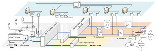 Modern ships are developing in the direction of large-scale, electrified, and intelligent. Electric propulsion has gradually replaced traditional heat engine propulsion and has become the preferred main power system for various ships today. The electrical structure of the port side power unit of an electric propulsion ship is shown in Figure 1. The power system of a large, intelligent ship generally adopts a regional power distribution scheme to support the operation of the electric propulsion system of an all-electric ship [17]. The scheme divides the ship’s load into multiple areas, such as propulsion area, living area, and important load, according to function and the degree of importance. Power is supplied by multiple gas turbines in the power generation area. The integrated power system monitors and evaluates the operation status of each area through sensor data. On the basis of ensuring the continuous and effective operation of the electric propulsion system, unified management and control of the electrical equipment of the whole ship are carried out according to the actual situation of navigation. As the main power unit of the ship, the propulsion system directly affects the safety of the ship during the voyage and needs to be given more attention.