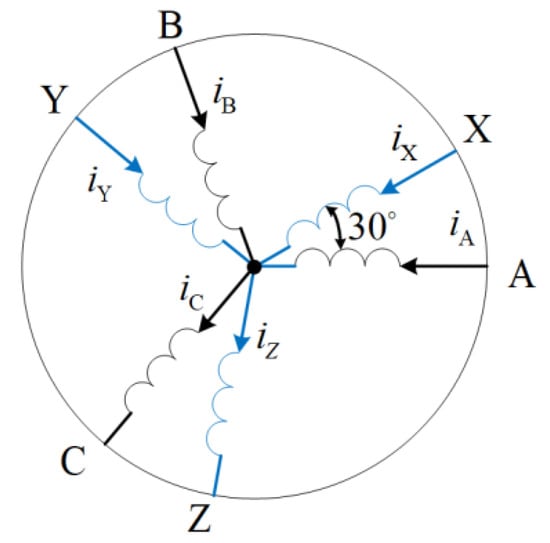 The ship’s six-phase propulsion unit is composed of a six-phase propulsion motor and a six-phase drive inverter. Compared with the traditional three-phase motor, the six-phase permanent magnet synchronous motor has obvious advantages in torque ripple, magnetomotive force waveform, and motor efficiency, and the multi-phase structure has the ability to realize high-power drive on the one hand, and the redundant structure on the other hand. It enables fault-tolerant operation of the motor after phase failure and improves the overall reliability of the propulsion system [18]. Therefore, six-phase PMSM is favored in large ships, luxury cruise ships, and other occasions that require high performance and reliability. Its stator winding structure is shown in Figure 2.