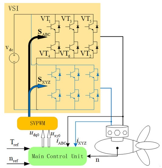 The six-phase motor of the ship is generally powered by two sets of three-phase two-level voltage source inverters (VSI). It can be seen from Equation (8) that the motor torque control can be achieved by controlling the output current of the inverter, and its topology is shown in Figure 3. The main control unit is based on the bridge. Given the speed and torque command, the speed sensor, and the feedback data of each phase current sensor, the motor control signal was calculated by the PI control algorithm, and the three-phase decoupling SVPWM method was used to generate the switching signal of the IGBT device of each bridge arm of the inverter to control the motor speed and rotation. The torque is used to drive the propeller to propel the ship to sail.
