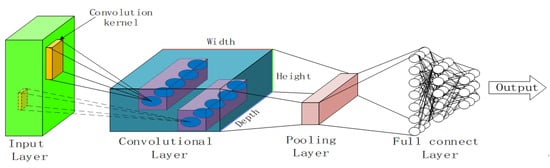 The convolutional neural network refers to a neural network that uses convolution operation instead of ordinary matrix penalty operation in at least one layer of the network and completes the extraction of local features of the original image through convolution and pooling operations. It is widely used in image classification, object detection, and other machine vision fields [24]. In fault diagnosis, CNN is usually regarded as a feature extractor composed of convolutional layers and pooling layers. It has the characteristics of local connection and weight sharing. It is a multi-layer supervised learning neural network for processing time-series data, which has a strong ability to deal with nonlinear problems. The typical CNN model mainly uses the convolution layer to perform the convolution operation (Convolution) to extract internal features; the pooling layer (Pooling) removes unnecessary information and improves the network generalization ability and calculation speed. The fully connected layer further abstracts and combines global time-series features and output, its structure is shown in Figure 6,