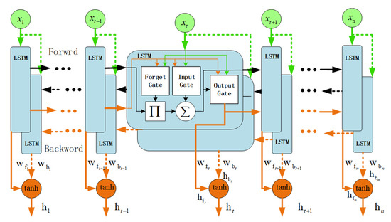 BiLSTM is a variant algorithm of LSTM. It consists of two layers of LSTM, one for forward propagation and one for reverse propagation. The forward layer starts the input iteration from the beginning of the sequence, the reverse layer starts the input iteration from the end of the sequence, and the output results of the two layers are combined to obtain the identification result. The state memory and transmission process are shown in Figure 9.
