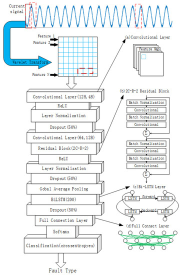 Its output , and is the weight of the output layer in the output mapping of the forward layer and the reverse layer. Bidirectional LSTM can simultaneously learn the future and past sequence data at the current time point and can effectively extract the time series features of the data sequence. Therefore, BiLSTM inherits the memory ability of RNN for time series data. At the same time, based on LSTM, it not only overcomes the problem that long-term historical signals cannot be transmitted to the current moment but also can better extract the time series in fault current signals due to the addition of the reverse layer information to improve the performance of the diagnostic model