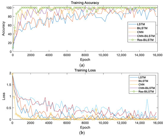 In the experiment, the existing deep learning model-based fault diagnosis methods LSTM, BiLSTM, CNN, and CNN-BiLSTM were used as the comparison models to compare with the Res-BiLSTM with the residual structure proposed in this paper. The training performance and comparison are shown in Figure 12.