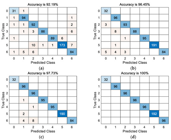 Analyzing the confusion matrix under noise interference in Figure 14, it can be found that the powerful feature extraction ability of CNN makes the method proposed in this paper still have a high diagnostic accuracy in the case of noise, but some fault features are difficult to extract due to the influence of noise, and the test set. The data are unbalanced, and the number of different fault data is inconsistent, so some fault data are mistakenly identified as a normal state. Secondly, the double-pipe fault can be considered as the arrangement and combination of single-pipe faults, and its characteristics are similar. In a low-noise environment, the time series features can be extracted by BiLSTM to distinguish, but under the influence of high noise, the time series characteristics of the data are affected, and there is a situation in which a double-tube fault is mistakenly identified as a single-tube fault.