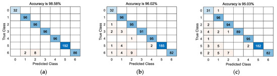 Confusion matrix of Res-BiLSTM fault classification results under different noises: (a) 25 dB; (b) 20 dB; (c) 19 dB.