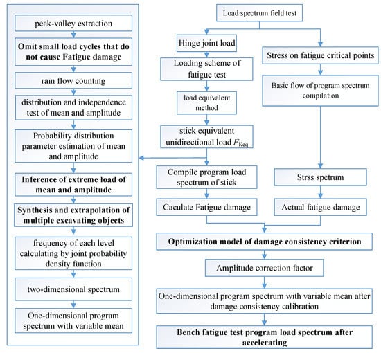 The compilation process of the bench fatigue test of the excavator stick is summarized in Figure 1. This paper mainly focuses on the following key steps: the threshold value of small load omitting; the extreme value inference criterion of the mean and amplitude; the synthesis and extrapolation of various typical operating conditions; and the correction, acceleration, and normalization of the program load spectrum.
